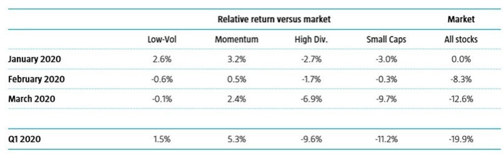 Los factores de momentum y baja volatilidad han mostrado una rentabilidad positiva en relación con el mercado, mientras que los títulos de capitalización reducida y dividendo elevado (value) han obtenido peores resultados2. En retrospectiva, los inversores deberían haberse centrado solo en baja volatilidad y momentum para encontrar cierta protección durante el primer trimestre de 2020. Marzo ha resultado particularmente complicado para los factores. Las orientación, aunque fuera reducida, hacia acciones value habrá resultado significativamente perjudicial para los resultados en este periodo de venta masiva.