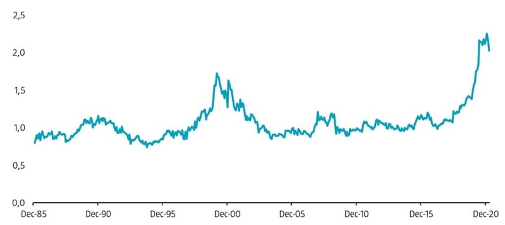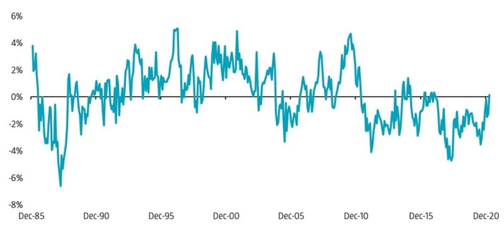 The long-awaited value comeback was triggered by the announcement of successful Pfizer-BioNTech Covid-19 vaccine candidate results on 9 November 2020. This culminated in strong returns for the value factor in the first quarter of 2021. Despite this rally, the spread in valuation multiples between expensive and cheap stocks remains at exceptionally high levels. Indeed, Figure 1 shows that the gap has surpassed levels last seen at the height of the tech bubble in the late 1990s, based on an enhanced value factor.1