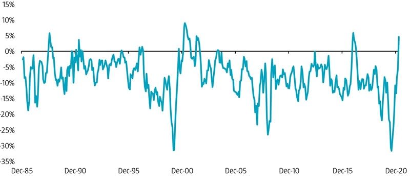 The recent value recovery has led to a change in sentiment regarding value stocks. Price momentum – measured as a stock’s return over the last 6 to 12 months – is one way to gauge market sentiment. While value and momentum tend to be negatively correlated – therefore providing diversification benefits – there have been a few periods in history when value stocks exhibited strong momentum. We expect this to happen again in the coming months.
