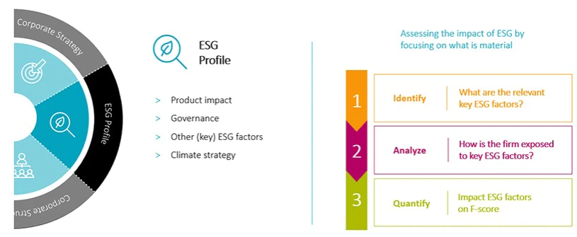 El enfoque clave de nuestro análisis crediticio es la capacidad de generación de liquidez del emisor, la calidad de sus flujos de efectivo y su capacidad de reintegrar las deudas. Evaluamos cinco factores para llegar a una conclusión en este sentido. Esta conclusión se expresa en forma de puntuación de los fundamentales, también llamada Puntuación F. El perfil ASG del emisor es uno de estos cinco factores.