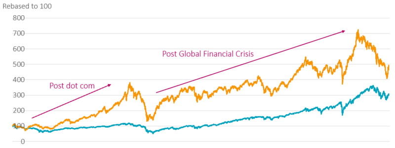 Aunque la renta variable de Asia-Pacífico ha protagonizado una notable recuperación a medida que se fue haciendo patente la dirección de las políticas económicas y de Covid en China, la brecha de valoración con Estados Unidos no se ha cerrado mucho, ya que las acciones estadounidenses también han repuntado. En otros ciclos anteriores de recuperación, tras la burbuja de las puntocom y después de la crisis financiera global, este tipo de brechas (Figura 1) han sido la antesala de fuertes y dilatados periodos de resultados relativos superiores para Asia-Pacífico.