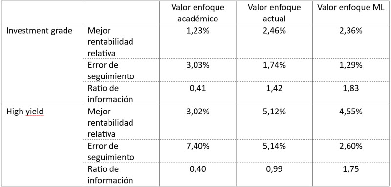 La mejora clave del enfoque basado en el machine learning en comparación con el enfoque de valor actual radica en la reducción del riesgo activo (error de seguimiento). El valor basado en el machine learning destaca por evitar las trampas de valor en el segmento de mayor riesgo del mercado, lo que se traduce en una menor exposición a los bonos de mayor riesgo. En la categoría de inversión se consigue esa reducción activa del riesgo, al tiempo que se genera una rentabilidad relativa ligeramente inferior a la del enfoque actual. En los bonos high yield, aunque la rentabilidad relativa es menor, el enfoque basado en el machine learning reduce significativamente el riesgo activo, lo que propicia un aumento significativo de la rentabilidad global ajustada al riesgo de la estrategia, como recoge la ratio de información. Todo ello pone de manifiesto la capacidad del factor de valor basado en el machine learning de generar una buena rentabilidad relativa con un nivel de riesgo moderado.
