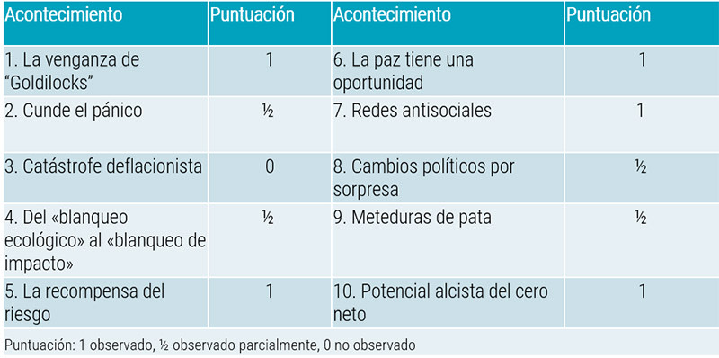 Estamos puntuándolos de modo que, si se observan estos riesgos, anotamos un punto; si no se observan, no tocamos el marcador; y si un resultado se observa parcialmente, anotamos medio punto. Así es como están influyendo por ahora los posibles escenarios que identificamos a principios de 2023: