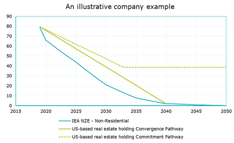 The Convergence Pathway – extrapolates an illustrative real estate company’s carbon-emissions trajectory based on emissions intensities measured at baseline year 2019 through 2050, the year in which the IEA and IPCC estimate all real estate sector companies will reach net-zero emissions.