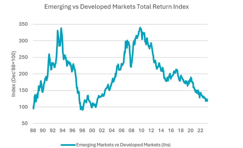 Si bien la renta variable emergente, impulsada por la influencia cada vez mayor de China, puede proporcionar grandes beneficios a los inversores de vez en cuando, en la última década ha sido más bien un motivo de decepción. Las divisas también han ofrecido una rentabilidad inferior en un contexto en el que el USD se ha beneficiado del excepcionalismo estadounidense. Además, la deuda de los ME es muy vulnerable a las subidas de tipos.