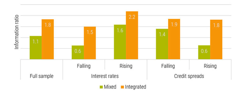Our study evaluates the mixed and integrated approaches in the USD corporate bond market from 1994 to 2022. Looking first at the factor portfolios for these approaches in high yield, we see that both result in a positive IR above 1. Note that in periods of rising/falling interest rates or credit spreads, both approaches result in higher returns than the market. This indicates that multi-factor investing in credits is in any case found to be a robust strategy in different market environments, including the rising interest rates of recent years.