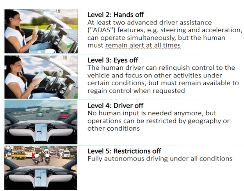 6 Advanced Driver Assistance Systems (sistemas de conducción asistida avanzada): incluyen funciones como las de control de crucero adaptable y mantenimiento automático del carril, las cuales, en su versión más avanzada, pueden tomar el control total del vehículo; pero requieren que el conductor mantenga la vista en la carretera en todo momento.