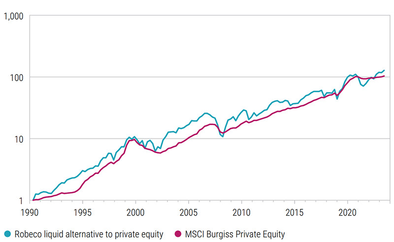 Simulated past performance is no guarantee of future results. For illustrative purposes only. Source: Robeco, based on portfolio simulation, cumulative return in USD, gross dividends reinvested, Developed markets, Q1 1991-Q3 2024, logarithmic scale. MSCI Burgiss returns are based on MSCI Global Private Equity Closed-End Fund Index (Unfrozen; USD). The performance shown is based on a simulated and hypothetical (back-tested) data and may suffer from the benefit of hindsight. Although Robeco is prudent in its assumptions for simulations, no representation is made that the index will achieve results similar to those shown and actual performance results may deviate significantly.