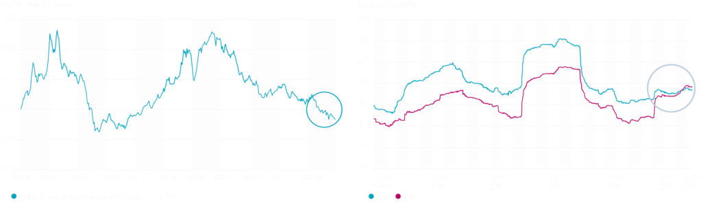 El gráfico de la izquierda muestra el diferencial de valoración del índice MSCI World respecto al índice MSCI Emerging Market. El diferencial de valoración se determina a partir de cuatro múltiplos bottom-up (precio/valor, precio/beneficios, precio/flujo de caja y precio/dividendo). Para cada múltiplo, la ratio de valoración del índice MSCI Emerging Markets se divide entre la misma ratio de valoración del índice MSCI World. El gráfico de la derecha muestra la desviación típica en cinco años consecutivos del índice MSCI Emerging Market y del índice MSCI World. Fuente: Robeco, MSCI, agosto de 2023.