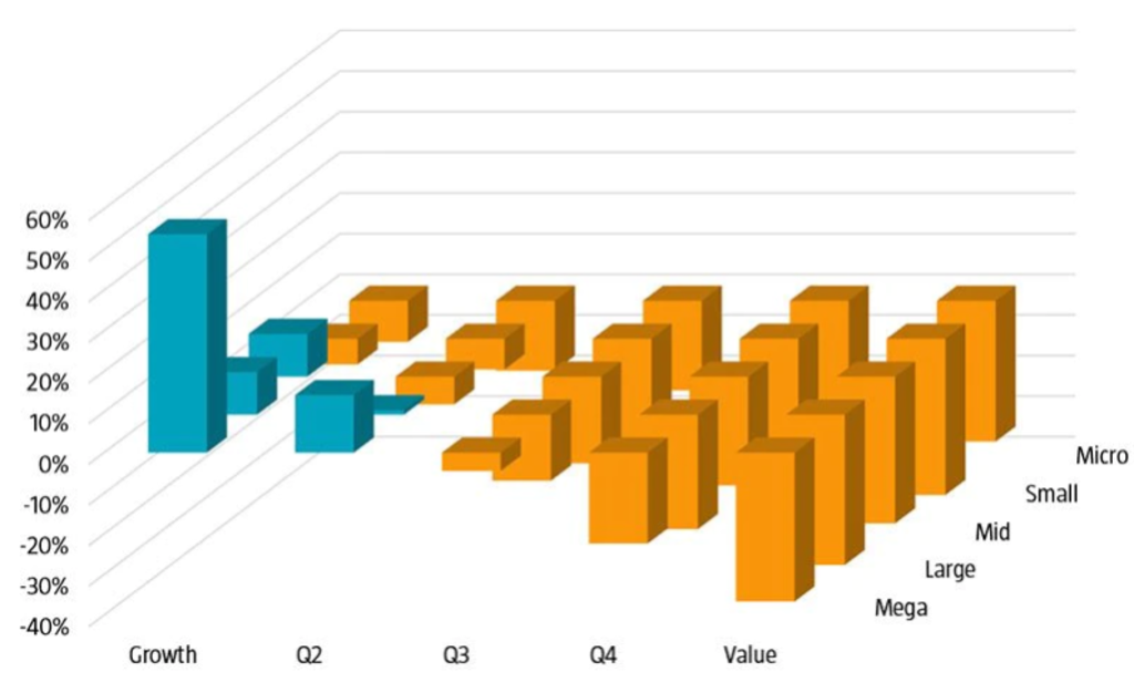 We conclude that there was basically only one way to outperform during this period, namely by investing in the largest and most expensive growth stocks. Indeed, our analysis shows that the mega-cap growth portfolio clearly had the strongest return as seen in Figure 2. This was the dominant phenomenon during the quant equity crisis, in which there were many ways to fail, but essentially only one way to succeed. This concentration of outperformance in one corner of the market and underperformance elsewhere is illustrated in Figure 2.
