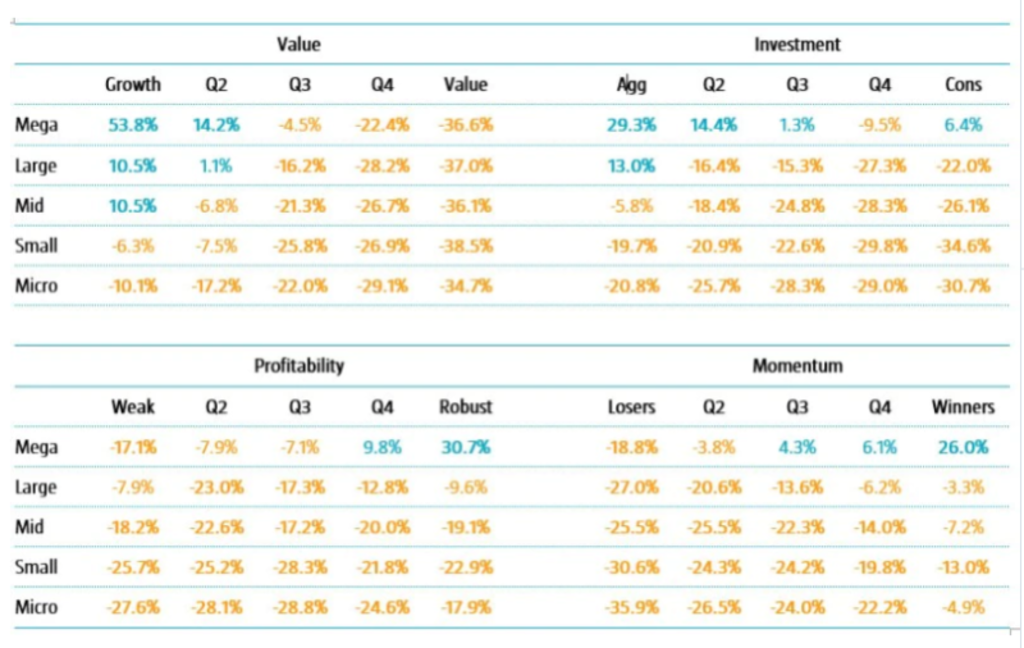 To better understand the drivers behind this factor performance, we look at the market-relative returns of portfolios sorted according to the various factors within different market-cap groups. As exhibited in Table 1, we observe that almost all the outperformance stemmed from investing in the largest stocks with particular factor characteristics.