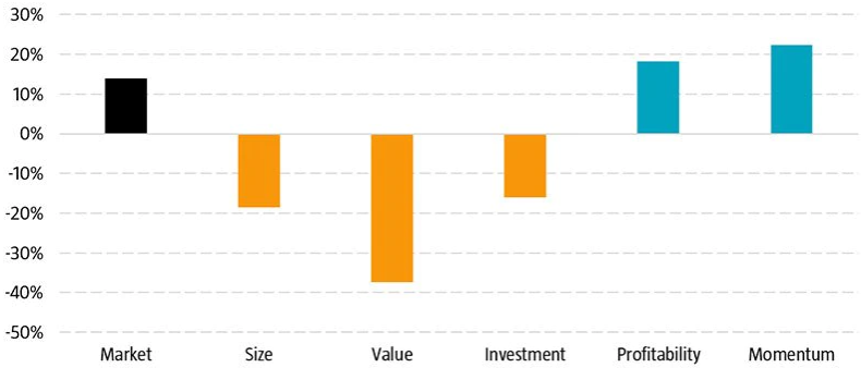 Source: Data library of Professor Kenneth French. Next to the capitalization-weighted market portfolio we consider the standard academic factors, size (SMB), value (HML), investment (CMA), profitability (RMW), and momentum (WML), as described in Fama and French (1993, 2015). The HML, CMA, RMW, and WML factors are based on 2x3 portfolios sorted independently on size and the target factor. All portfolios are capitalization weighted, and all returns are compounded total returns in US dollars. These returns reflect hypothetical, backtested portfolios which ignore costs, fees and taxes. Past returns are no guarantee for the future.