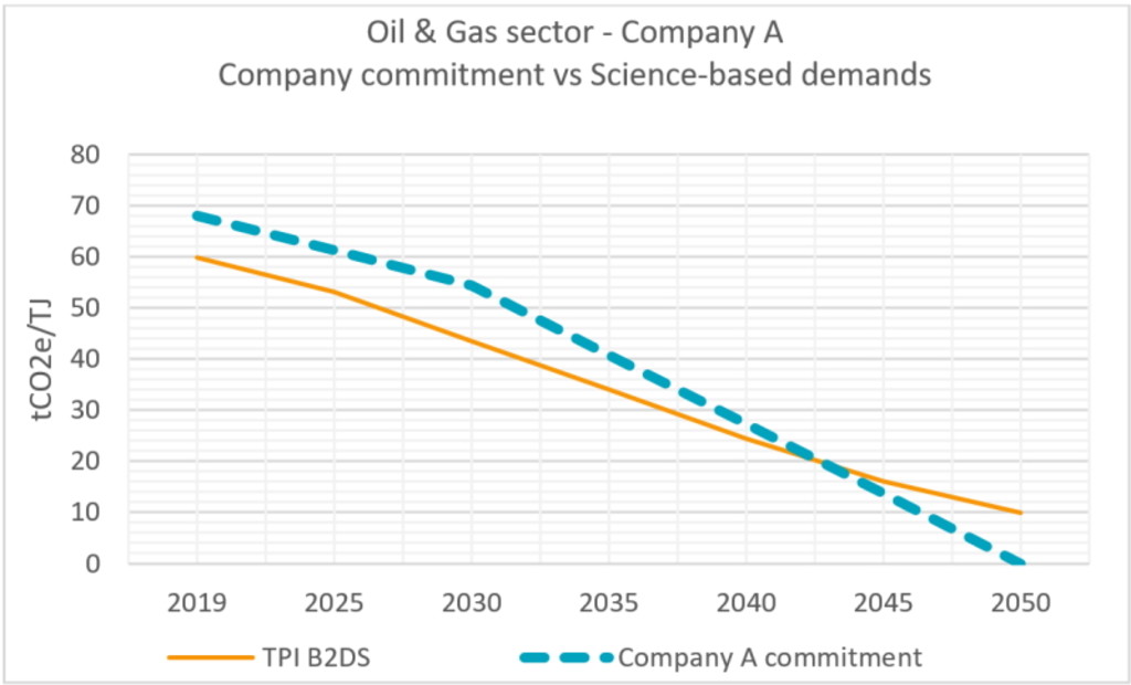 The blue dotted line indicates Company A’s Commitment Pathway based on its planned emission reduction disclosures. The orange line indicates the scientifically modelled benchmark for the oil and gas sector in order to keep global temperatures below 2 °C by 2050 (the TPI Below 2 °C Pathway (or TPI B2DS). The closer the alignment between pathways, the better a company’s decarbonization score.2