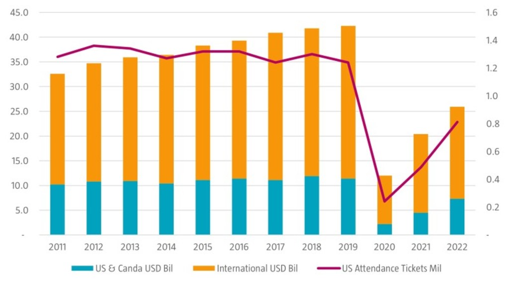Wakanda may be forever, but the future of movie theaters is less certain. With theaters shuttered in 2020, box office revenues naturally plummeted and have not fully recovered since. In 2021, global theatrical revenues jumped 70%. Super heroes like Spiderman drew audiences back to the big screen. In 2022 the recovery continued, rising 27% year on year as studios released further installments of big franchises like Avatar, Top Gun, and Jurassic World.