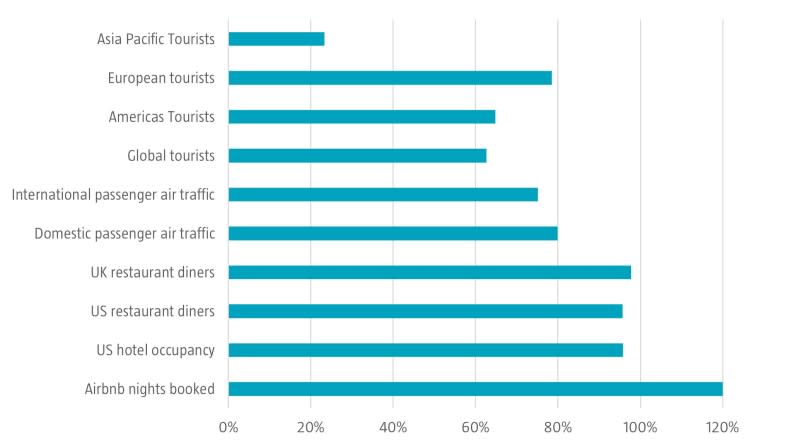 According to the IATA, in 2022 passenger air traffic as measured by revenue passenger kilometer (RPK) reached 80% of 2019 levels on domestic flights and 75% on international flights. Restaurants and hotels have seen the largest recovery. OpenTable’s index of seated diners at restaurants that reopened reached 96% of 2019 levels in 2022 in the US, and 98% in the UK. Bloomberg reports that during 3Q22, hotel occupancy in the US was down just 4.2% versus 3Q19.