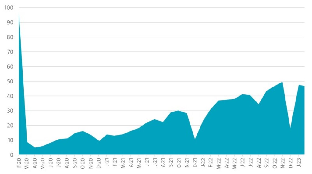 The travel and hospitality sector is another sector that bounced back as restrictions eased, but still remains below pre-pandemic trend. According to the United Nations, in 2022, global tourism reached 63% of the levels recorded in 2019 with Europe achieving 79% recovery and the Americas 65%. With China’s prolonged border closure tourist traffic in the Asia-Pacific region in 2022 reached just 23% of 2019 levels.