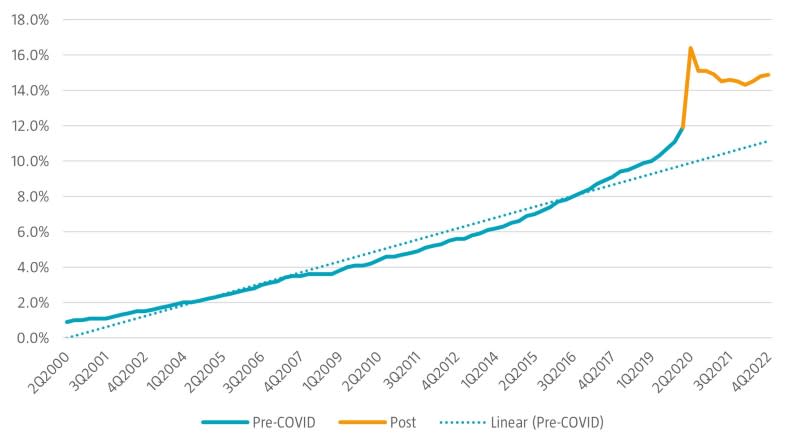 As pandemic restrictions forced most retail stores to close their doors, e-commerce’s share of retail sales in the US accelerated from 11.1% in 4Q19 to a peak of 16.4% in 2Q20. Unsurprisingly, as restrictions eased and high-street shops reopened, e-commerce sales growth decelerated, and its share fell to 14.3% by 2Q22. Nevertheless, in recent quarters, e-commerce growth re-accelerated, reaching 14.9% share during 4Q22; a level that remains well above the pre-pandemic trendline.