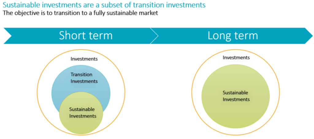 Si la transición sostenible se considera un objetivo medioambiental o social, los activos de transición que no causen daños significativos y sigan prácticas de buen gobierno también pueden ser, por tanto, una inversión sostenible. Esto significa, por ejemplo, que los bonos verdes pueden considerarse tanto una inversión de transición como una inversión sostenible. Sin embargo, no todas las inversiones de transición son sostenibles.