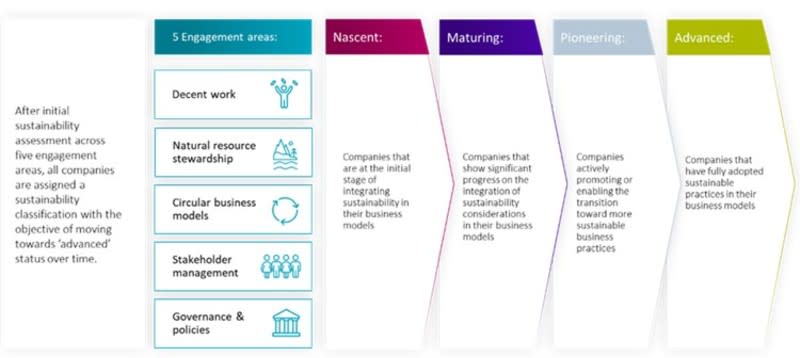 Bien que les éléments du processus soient les mêmes, cela ne signifie pas que les entreprises sont traitées sur un pied d’égalité. L’équipe explique que cela est nécessaire étant donné que « les entreprises sont confrontées à une myriade de contraintes uniques, notamment l’accès aux ressources financières, au savoir-faire et à la technologie en fonction de leur situation géographique ou de leur position dans la chaîne d’approvisionnement. » En tenant compte de cela, ils adaptent les attentes en matière d’engagement en fonction du niveau initial d’intégration de la durabilité par les entreprises.