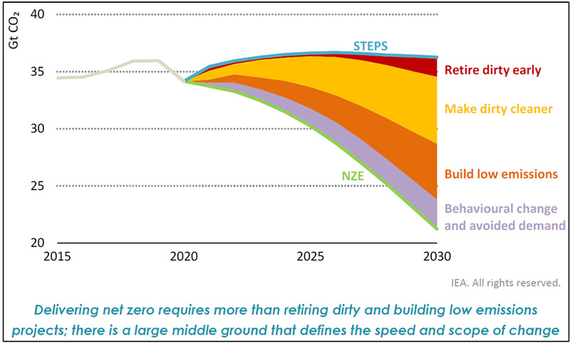 « Il a germé de l’investissement durable. Nous nous sommes attachés à investir dans des entreprises et des secteurs verts, généralement définis comme concevant des solutions de remplacement sobres en carbone, comme les énergies renouvelables. Toutefois, si l’on examine la trajectoire politique de l’Agence internationale de l’énergie (AIE)1, la construction de structures sobres en carbone ne représente que de 15 à 20 % de la réduction nécessaire. Comme indiqué ci-dessous, le problème tient au fait que le gros du travail est à fournir dans la section jaune : « rendre ce qui est sale plus propre ». Il faut donc consentir des investissements dans la transition afin d’aider les entreprises et les secteurs à améliorer leurs processus pour créer des pratiques plus vertes ».