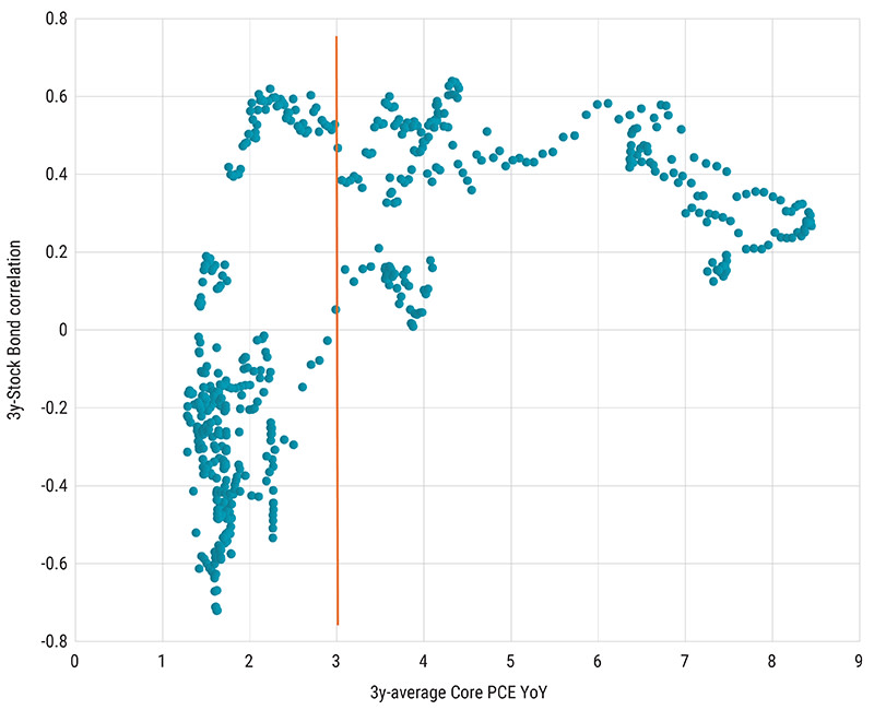 Source : Robeco, Bloomberg, au 31 juillet 2024. Données mensuelles à partir de 1973. Les corrélations ont été calculées pour le marché américain des actions et des obligations. Indice Core PCE : indice de base américain des prix des dépenses de consommation personnelle.