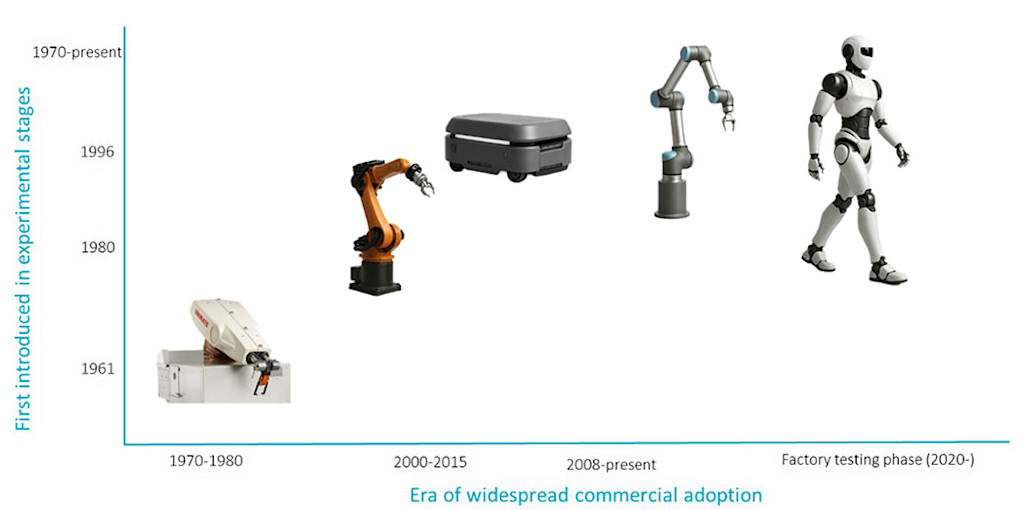 De gauche à droite : 1) Le modèle de robot Unimate a été introduit pour la première fois sur une chaîne de montage de GM en 1961. 2) Un bras robotique traditionnel utilisé pour des tâches telles que le soudage. 2) Un robot mobile autonome (AMR) utilisé pour le transport de marchandises en entrepôt. 3) Un cobot – un bras robotique doté d’une flexibilité et d’une sécurité accrues pour travailler aux côtés de l’homme. 4) Un robot humanoïde doté de mouvements, de précision et de dextérité comparables à ceux d’un être humain.