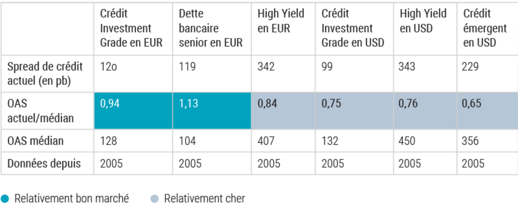 Cette comparaison, exprimée sous la forme d’un ratio, montre clairement si une catégorie est bon marché (ratio supérieur à 1) ou onéreuse (ratio inférieur à 1). À titre d’exemple, si l’on s’intéresse au crédit Investment Grade libellé en USD, qui se négocie actuellement à un ratio de spread de 0,75, ce ratio montre que le marché est plus onéreux d’environ 25 % que son niveau historique à long terme.