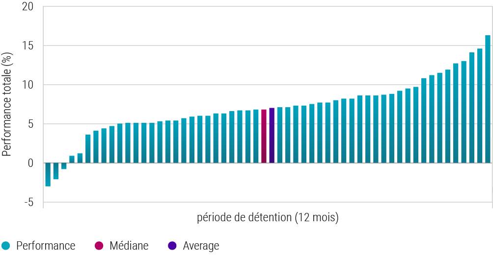 Pour évaluer le potentiel de performance totale des crédits Investment Grade dans l'environnement de taux actuel, nous avons analysé les périodes de douze mois des 22 dernières années qui ont débuté avec des niveaux de taux similaires. Nous avons ensuite calculé les performances totales au cours de ces périodes. La figure ci-dessous montre la distribution des performances totales des 56 périodes de douze mois de notre échantillon de recherche, chacune d'elles ayant débuté avec un taux compris entre 4 % et 5 %.