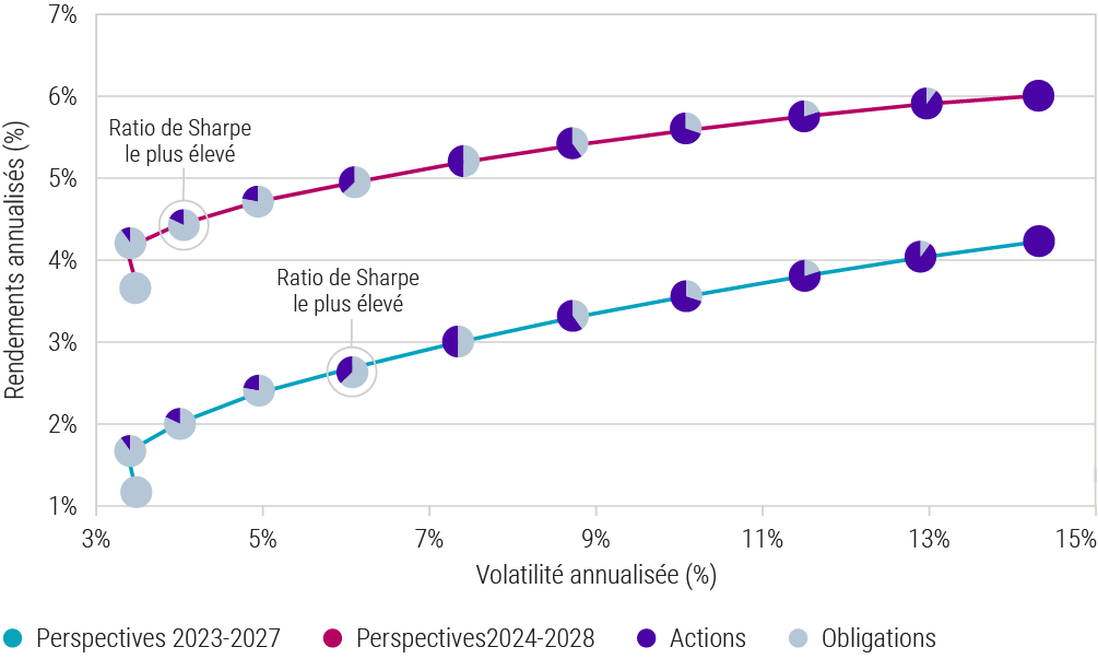 Frontières efficientes des obligations et des actions pour les perspectives 2023-2027 par rapport à 2024-2028