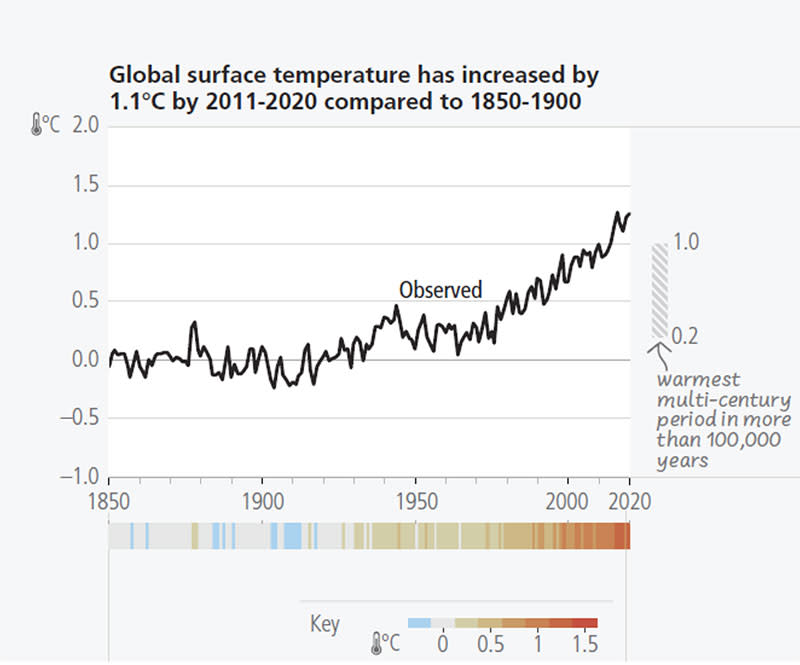 « Les activités humaines, principalement par le biais des émissions de gaz à effet de serre, ont sans aucun doute causé le réchauffement de la planète, la température à la surface du globe atteignant 1,1 °C de plus en 2011-2020 par rapport à 1850-1900 », indique le rapport.