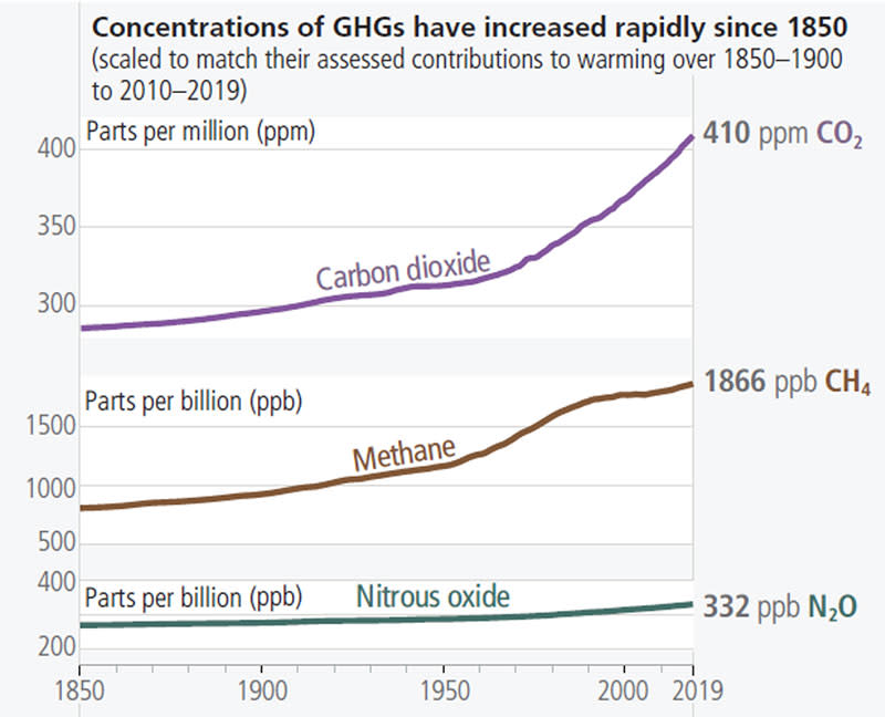 « Les émissions mondiales de gaz à effet de serre ont continué d’augmenter, avec des contributions historiques et actuelles inégales provenant d’usages non soutenables de l’énergie, de l’utilisation des terres et du changement d’affectation des sols, des modes de vie, des modes de production et de consommation entre les régions, entre et au sein des pays et entre les individus.