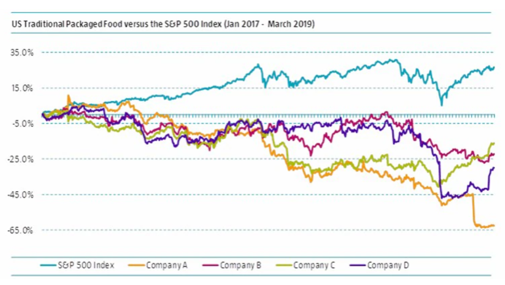 Or, les consommateurs sont beaucoup plus avertis aujourd’hui et choisissent des marques et des produits différents. Il n’est donc pas surprenant que les résultats de la plupart des sociétés agroalimentaires basées aux États-Unis baissent depuis au moins 2017 par rapport à l’indice S&P 500. Nombre de ces entreprises cherchent à réorienter leurs portefeuilles en procédant à des acquisitions.