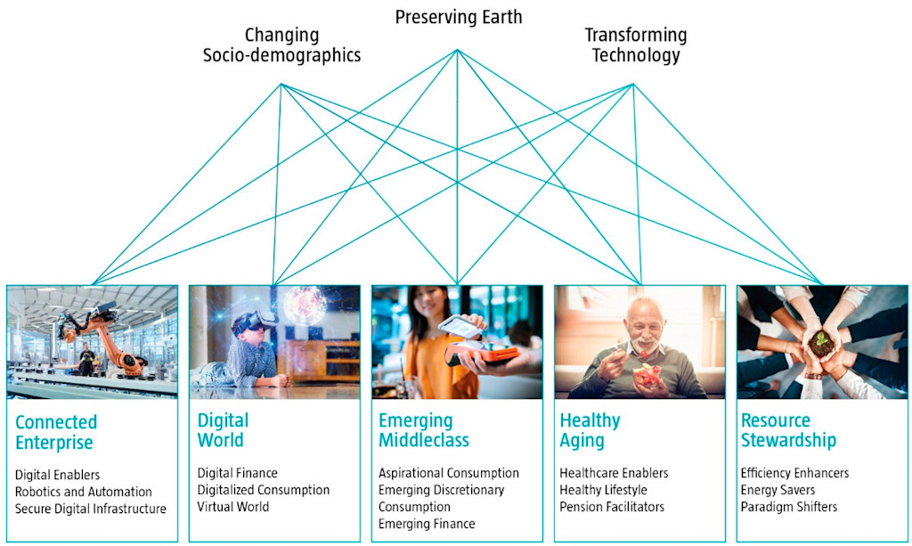 Comme l’explique le Grand livre de l'investissement thématique, l’équipe d’investissement thématique de Robeco distingue trois catégories de mégatendances qui vont façonner notre avenir : les « Technologies transformantes », les « Changements sociodémographiques » et la « Préservation de la Terre ». Elles découlent des changements technologiques, démographiques et politiques qui transforment la société depuis l’aube de l’humanité. Au sein de ces grandes catégories, les différentes équipes d’investissement thématique sélectionnent des tendances d’investissement plus étroites, qui peuvent elles-mêmes être décomposées en tendances et sous-tendances toujours plus spécifiques.