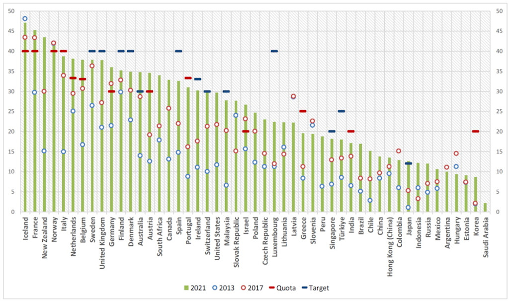Le graphique montre les progrès obtenus lorsque les pays prennent délibérément des mesures pour placer les femmes dans les conseils d’administration, que ce soit sous forme de quotas ou d’objectifs. Les quotas sont des dispositions législatives strictes, tandis que les objectifs sont des recommandations plus souples. Les politiques relatives à la parité dans les conseils d’administration peuvent considérablement varier d’un pays à l’autre. Voir le rapport de l’OCDE pour plus de détails sur ces différences.