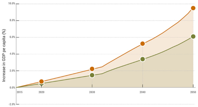 Le graphique présente les répercussions positives de l’égalité femmes-hommes sur le PIB par habitant dans l’UE entre 2015 (année de référence) et 2050. La ligne verte représente l’augmentation du PIB en cas de progrès insuffisants vers la parité, et la ligne orange l’augmentation en cas de réformes plus rapides.