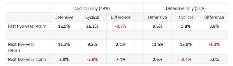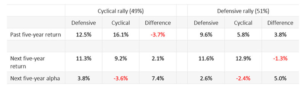 Defensive stocks outperformed cyclical ones in 51% of past five-year periods over our full sample period, with cyclical stocks leading in the remaining 49% â reflecting a broadly even split. Following a five-year period of strong performance for cyclical stocks, the subsequent five years usually favor defensive stocks. Moreover, defensive stocks have a positive alpha â measuring risk-adjusted returns â of 3.8% compared to a negative alpha of -3.6% for their cyclical peers. After a defensive rally, they continue to perform well but tend to slightly lag cyclical stocks by 1.3%. Overall, this environment is attractive for equity markets, whereas the alpha spread remains a healthy 5.0%. Similar outcomes for subsequent five-year returns are found when three-year and seven-year lookback periods are considered.