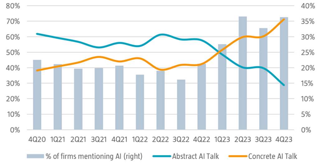 Dans les années 1960, Roy Amara, professeur à l'Université de Stanford, a déclaré : « nous surestimons l'impact de la technologie à court terme et sous-estimons son effet à long terme. » Les attentes à l'égard de l'IA ne semblent pas modérées. Goldman Sachs estime que l'IA pourrait permettre d'automatiser jusqu'à un quart des emplois aux États-Unis et en Europe, et PWC prévoit que l'IA apportera 15 700 milliards de dollars supplémentaires au PIB mondial d'ici 2030. S'il y a peu d'entreprises dont les revenus dérivés directement de l'IA sont clairement mesurables actuellement, plus d'un tiers des entreprises de l'indice S&P 500 ont discuté de l'IA lors de leurs annonces de résultats en 2023.