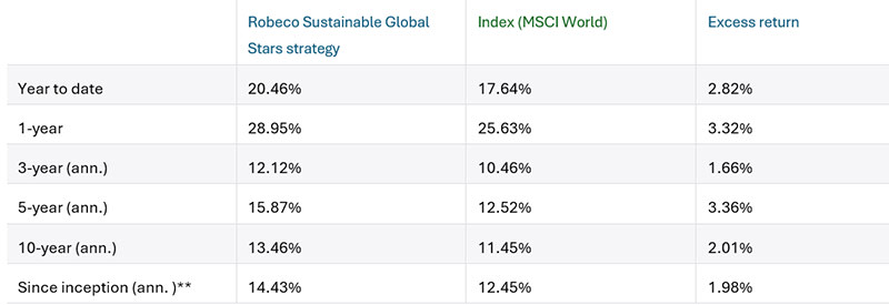 Source : Robeco, au 31 septembre 2024, en euros. La performance depuis le lancement est calculée à partir du premier mois complet. Les périodes inférieures à un an ne sont pas annualisées. La valeur de vos investissements peut fluctuer. Les performances passées ne garantissent pas les résultats futurs. Performances brutes de frais, sur la base de la valeur brute d'inventaire. Les valeurs et performances indiquées sont brutes de frais : elles ne tiennent pas compte des frais de gestion ni de tout autre coût d'administration du fonds, ni des commissions et coûts éventuellement prélevés lors de la souscription, du rachat et/ou de la conversion de Parts. Ceux-ci ont un effet négatif sur les performances indiquées. **Décembre 2008