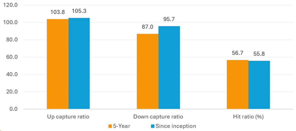 Figure 2 : Taux de réussite de la stratégie Robeco Sustainable Global Stars : Participation à la hausse et résilience à la baisse