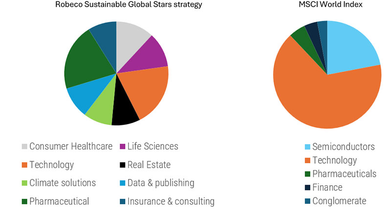 Cette approche privilégie le ROIC et le rendement de FCF en tant que principales forces motrices de la création de valeur à long terme dans notre stratégie d’investissement. Et elle a fait ses preuves, comme en témoignent les solides performances ajustées du risque générées au fil des ans et dans des contextes économiques différents. La stratégie Sustainable Global Stars de Robeco affiche un ROIC de 29,75 % contre 11,3 % pour son indice de référence, l’indice MSCI World, et un rendement de FCF de 4,7 % contre 4,6 %2, ce qui reflète l’accent que nous avons mis sur ces deux indicateurs. Ce processus permet de nous constituer un portefeuille à la composition très différente de celle de l’indice de référence, comme le montre le Graphique 1 ci-dessous, et offre une réelle diversification à nos clients.
