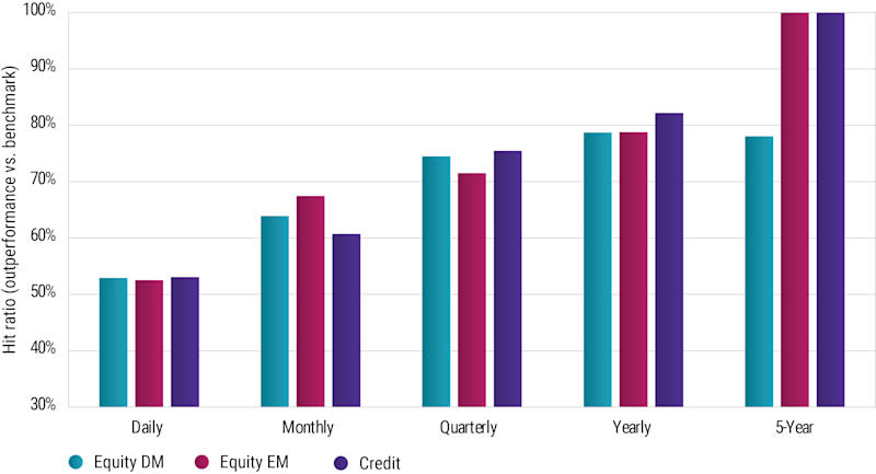 Figure 1 shows these hit ratios for different investment horizons for both Robeco enhanced indexing equity and credit strategies. You can see clearly that the hit ratios increase with the investment horizons. While the daily hit ratios are all between 52% and 53% (so just slightly below Federer’s hit point win rate of 54%), these ratios increase to about 60% (monthly), 75% (quarterly), 80% (yearly), and, in the case of Enhanced Indexing in emerging market equities and investment grade credits, to 100% for five-year horizons.2