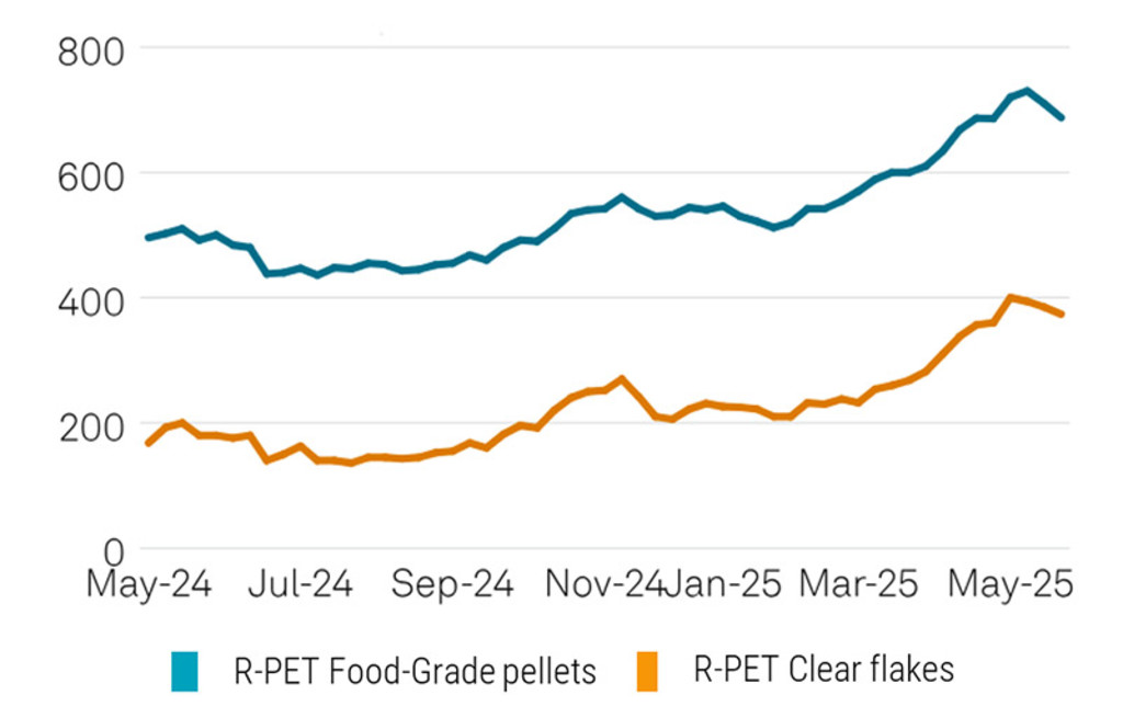 Le graphique montre les écarts de prix entre deux qualités de plastique PET recyclé (Food-Grade Pellets et Clear Flakes) et le plastique PET vierge en Europe. Les plastiques recyclés sont nettement plus chers. En mai, le prix des granulés pour applications alimentaires (Food-Grade Pellets) était de 700 EUR/tonne, soit 400 EUR de plus que les granulés de PET vierge. Les granulés pour applications alimentaires sont traités selon des normes de qualité plus strictes et peuvent être utilisés pour l'emballage de produits alimentaires ou de médicaments. Les flocons transparents (Clear Flakes) sont utilisés comme matière première pour des applications industrielles dont les critères de qualité sont moins stricts.