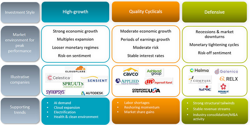 Une trop grande concentration sur les fournisseurs de services de recyclage et de gestion des déchets en aval réduit l'univers d'investissement et limite l'exposition à des opportunités attractives dans l'ensemble des chaînes de valeur de l'industrie. L'élargissement du champ d'application aux fournisseurs de solutions en amont permet non seulement d'accroître le potentiel de rendement du portefeuille, mais aussi de diversifier l'exposition du portefeuille à différents facteurs de style, notamment l'innovation à forte croissance, les valeurs cycliques composées de haute qualité et les valeurs sûres défensives (voir Figure 3).