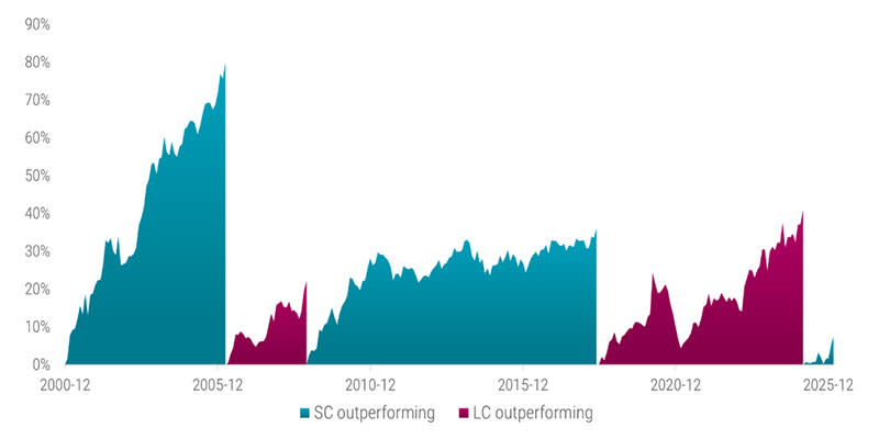 Source : Robeco, LSEG, MSCI. Le graphique montre la performance relative de l'indice MSCI World par rapport à l'indice MSCI World Small Cap. Un nouveau cycle commence après le pic du marché précédemment surperformant, une fois que le marché précédemment sous-performant a surperformé d'au moins 20 % par rapport à son plus bas précédent (à l'exception du dernier cycle des petites capitalisations, qui a débuté en février 2025). La performance est basée sur les indices de rendement total de fin de mois en USD. La période étudiée s'étend de décembre 2000 à février 2026.