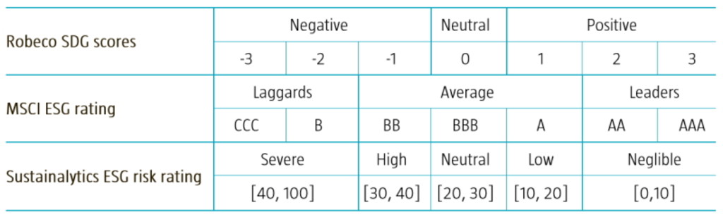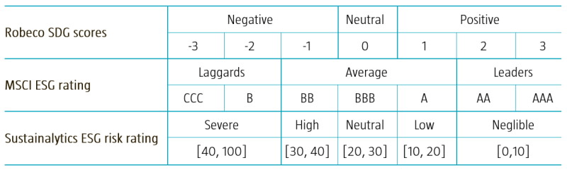 For instance, the Robeco SDG scores and MSCI ESG ratings apply a categorical scale, ranging from -3 to +3, and from CCC to AAA respectively. The Sustainalytics ESG risk ratings assign a quantitative risk score that is used to place a company in one of five risk categories, ranging from severe to negligible. This is summarized in Table 1.