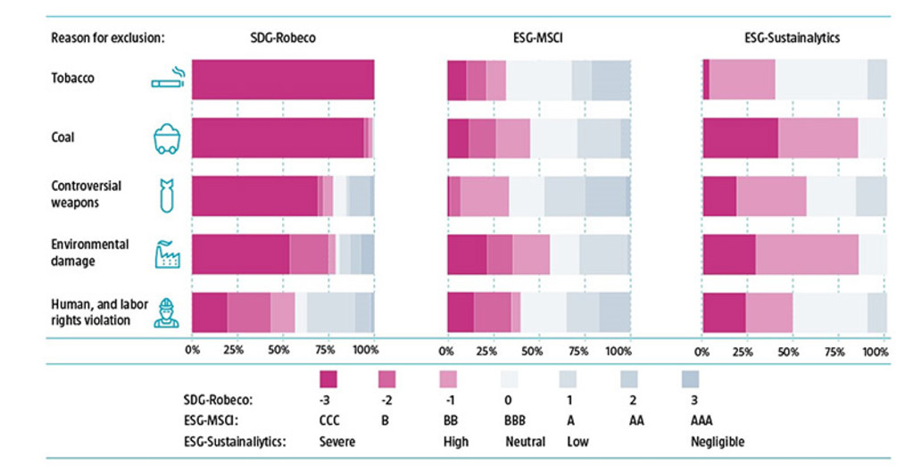 For example, Figure 1 shows that more than half of the tobacco producers that are excluded from the portfolios of large asset owners receive an average ESG rating or are even considered ESG leaders by MSCI. Similarly, more than half of these companies are assessed as having neutral or even low ESG risk according to Sustainalytics. By contrast, all of these firms receive the lowest Robeco SDG score of -3, in line with the harmful products they produce. Similarly, we find that stocks that are avoided for other reasons that are deemed important by large asset owners have SDG scores that are seemingly more aligned with the negative impact they inflict on society.
