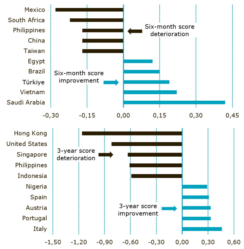 Data note: The chart displays countries with the largest score losses (left) and gains (right) over the past six months and three years ending October 2022. Only countries within the universe comprising the top-50 developed and emerging economies in terms of nominal GDP are shown.