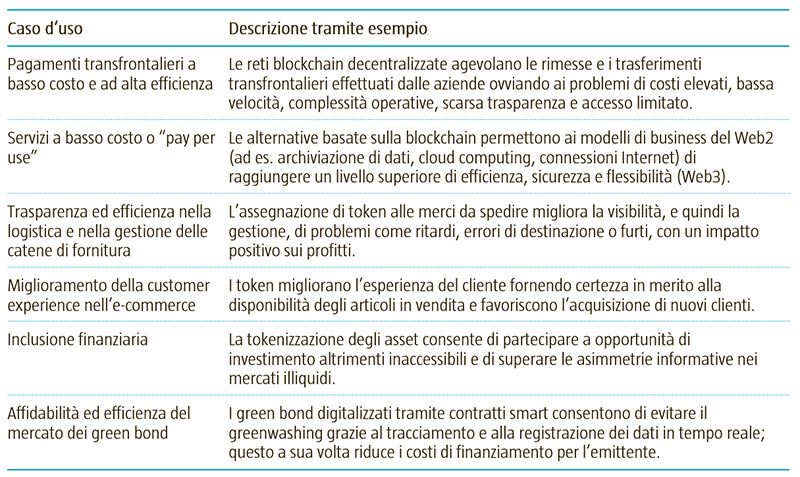 Al di là dei titoli dei giornali, è in atto una rivoluzione silenziosa da parte di start-up e aziende che applicano la tecnologia blockchain per cambiare e migliorare il modo di condurre i propri affari. Tra gli esempi figurano l’applicazione da parte di MGM di contratti smart ai biglietti dei concerti con benefici aggiuntivi, l’elaborazione da parte di JP Morgan di oltre 430 miliardi di dollari di operazioni di pronti contro termine infragiornaliere tokenizzate e la tokenizzazione da parte di Walmart della propria catena di fornitura per ridurre i tempi della tracciabilità di un determinato alimento da 7 giorni a 2,2 secondi. Nella Figura 3 è riportato un elenco non esaustivo dei casi d’uso attuali.