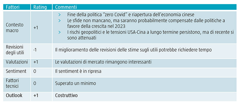 Di seguito riassumiamo le attuali prospettive per gli investitori in Cina sulla base del nostro modello a cinque fattori.