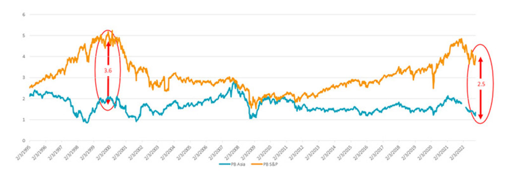 Fonte: Fonte: MSCI, Bloomberg. Rapporto prezzo/valore contabile MSCI Asia ex Japan e indici S&P 500. Intervallo dei dati: dicembre 2000-aprile 2023